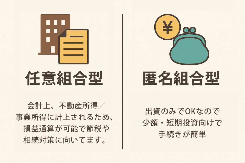 • ■任意組合:不動産の所有権を持ち、長期安定収益や相続対策に適している一方で、無限責任というリスクも。