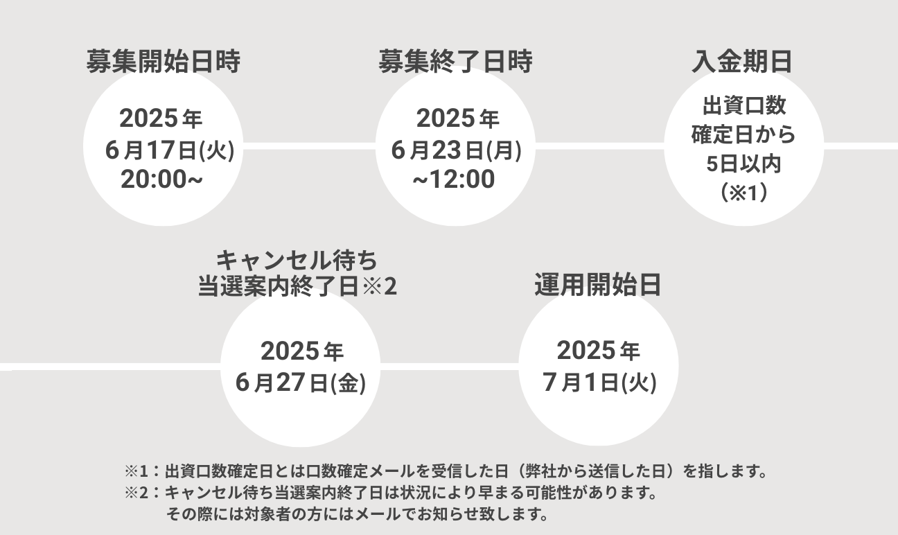 ご応募・ご契約いただいたにも関わらず出資金をご入金いただけない場合、今後のお取引をお断りさせていただく場合がございますので予めご了承ください。